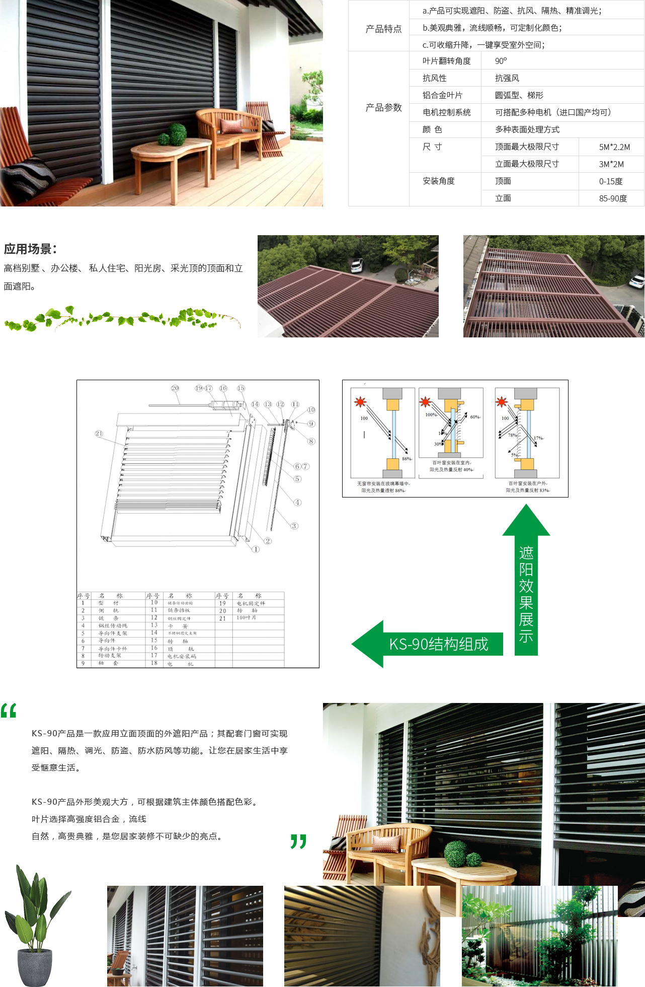 KS-90可收缩翻转百叶窗,作为新兴的天棚遮阳产品,给遮阳和家居生活带来了新的理念。可收缩翻转系统的隔热性、通透性、整体性、安全可靠性最大限度的保障了我们对光线的需求。KS-90产品符合国家绿色节能建筑理念,充分满足未来建筑对于外遮阳产品的需求,外观处理上更加简洁大气,可以和主体建筑完美融合,可以让您在品茗论道中体验高品质生活。