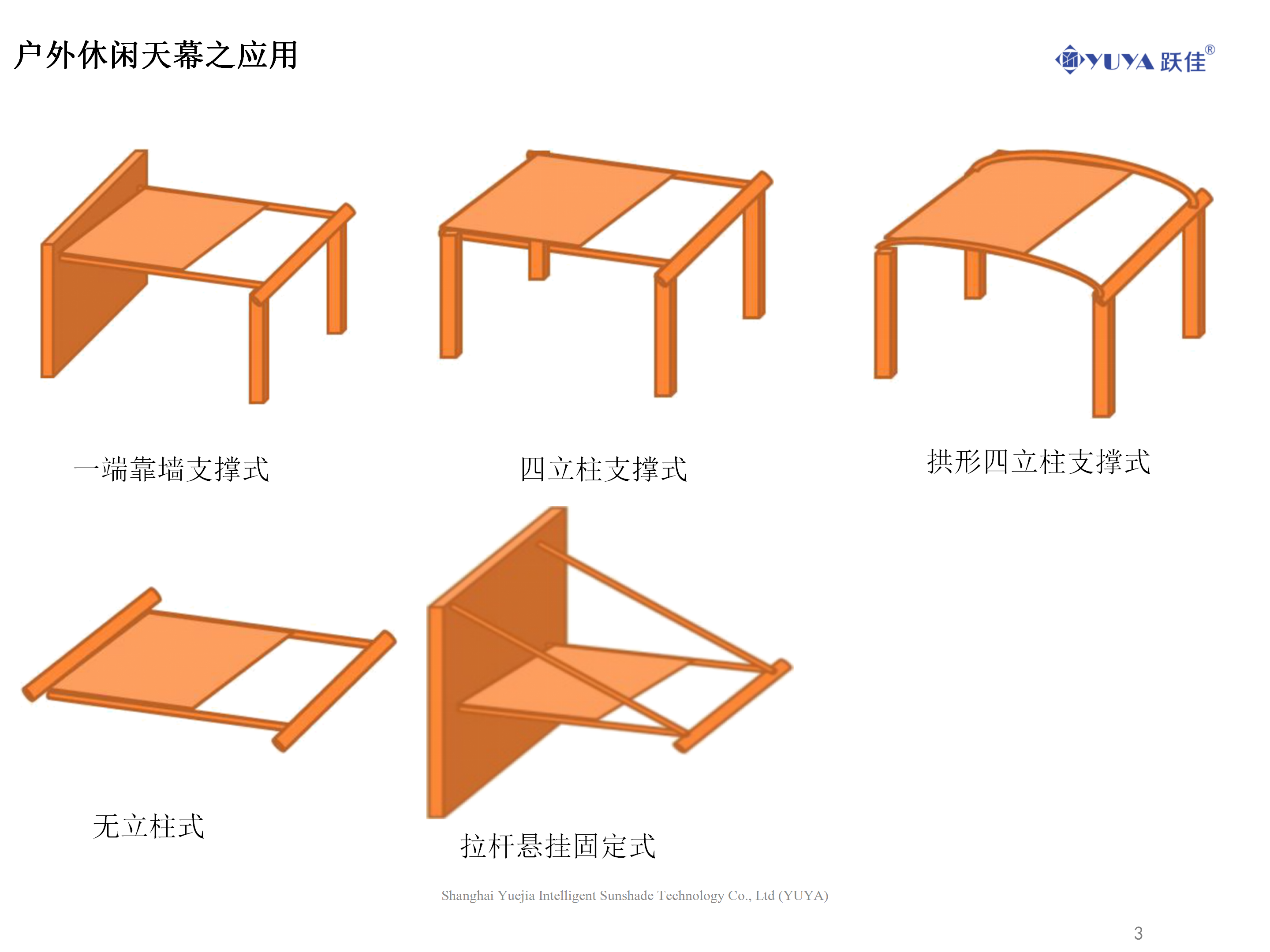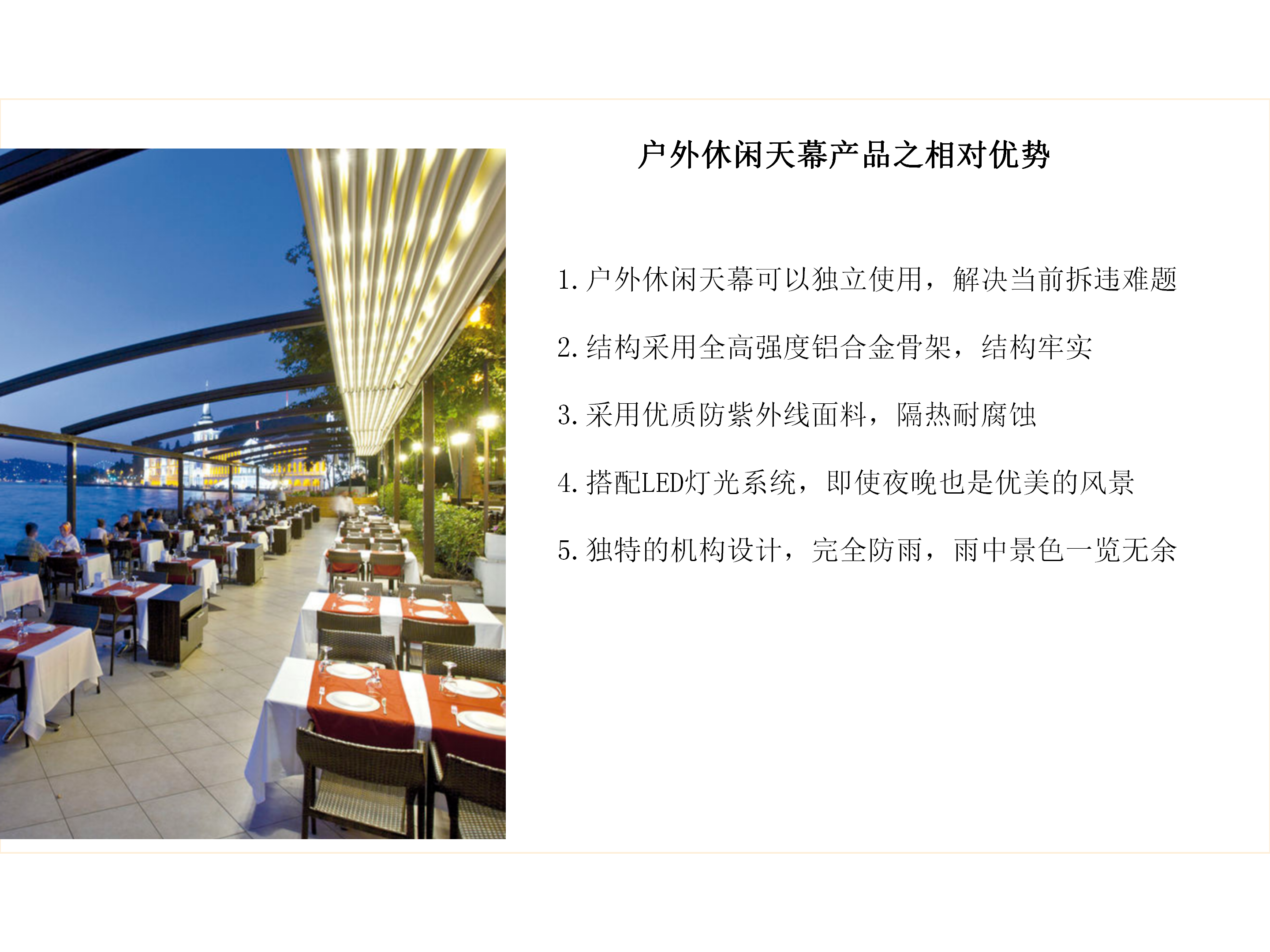 户外防雨休闲天幕是一种轨道天蓬和伸缩遮阳篷的结合。布料通过特制的电机随 铝制轨道伸缩移动,打开时,防水 PVC 天幕收回,让客户感受大自然的阳光与空气,闭合后可以100%有效阻挡太阳光及紫外线,削弱热能扩散,同时兼顾防水。产品不仅是在遮阳中实现其性能,也能在空间配套上起到重要装饰作用。产品能最低承受 50km/h 的风力。室外电动轨道天篷不仅是跃佳室外遮阳系统的新科技,更是跃佳为实现推进全人类享受阳篷下的欢乐时光这一理念的笃定步伐。