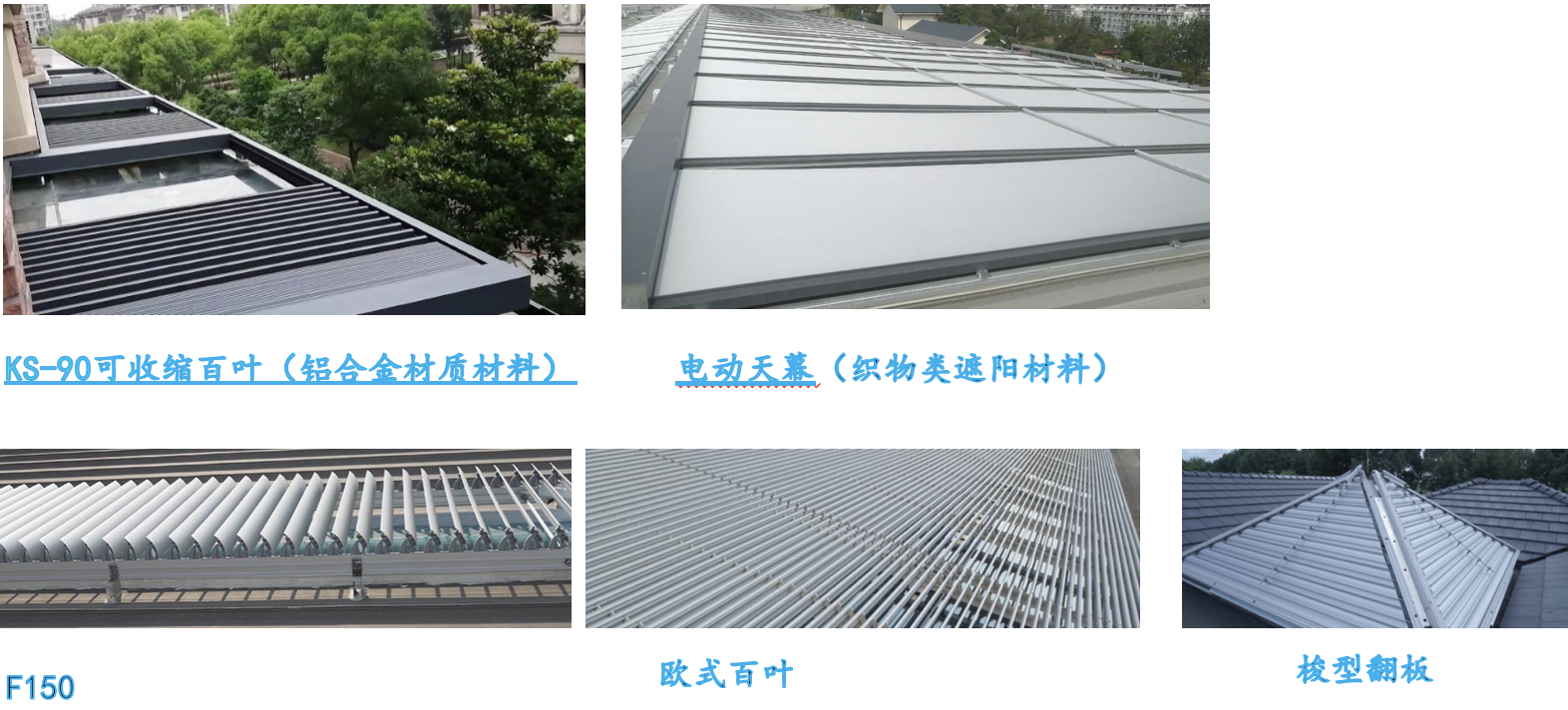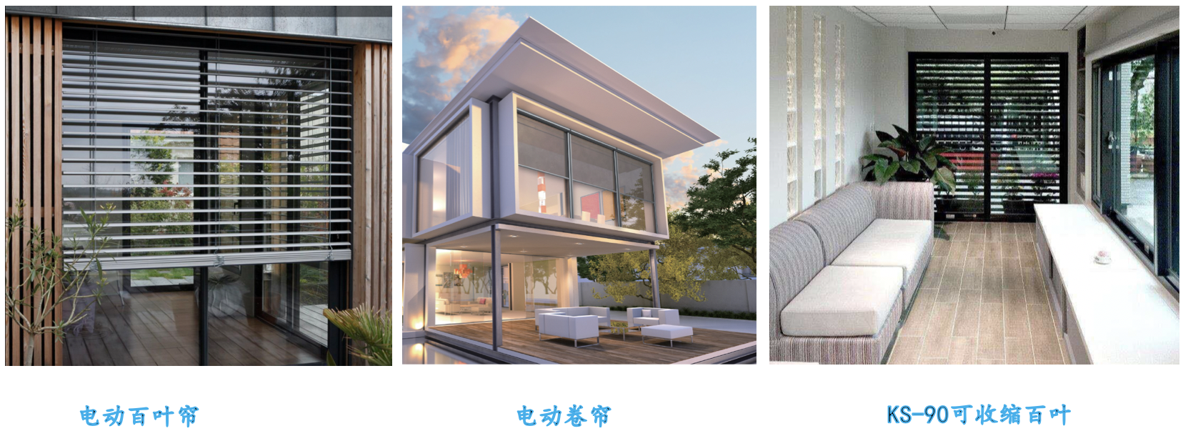 b.阳光房立面遮阳产品还可以选用电动百叶帘( C50 、C60、CR80),电动卷帘及KS-90可收缩百叶(铝合金材质材料)。